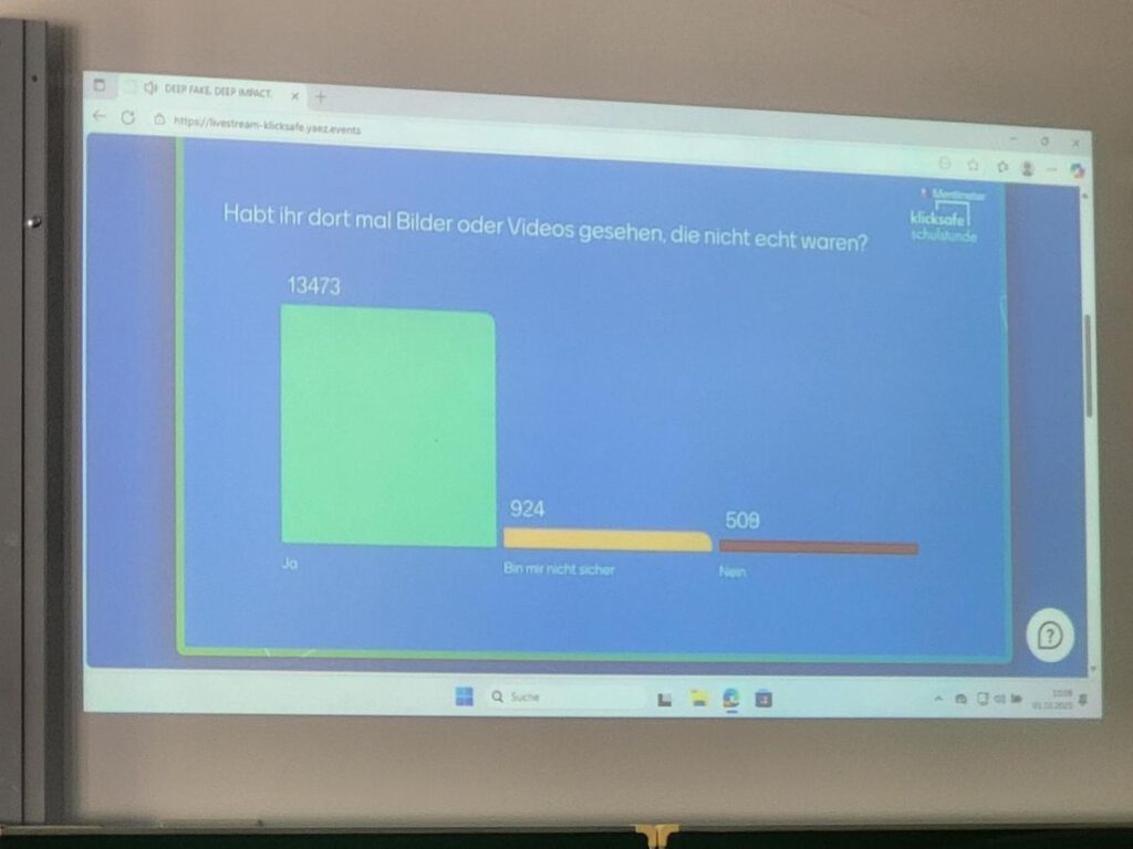 Am 1. Oktober nahmen die 7. Klassen unseres Gymnasiums an einer digitalen Unterrichtsstunde der EU-Initiative klicksafe teil. Thema der Veranstaltung war das hochaktuelle Phänomen der Deepfakes – also digital veränderte Bilder, Videos oder Tonaufnahmen, die täuschend echt wirken.