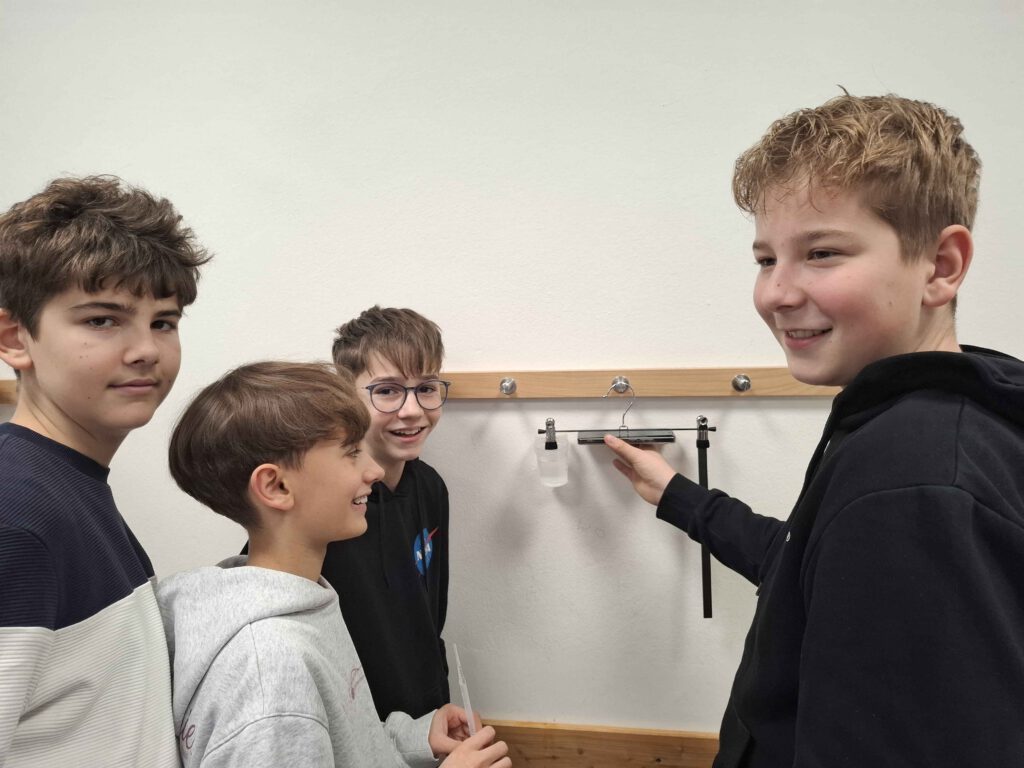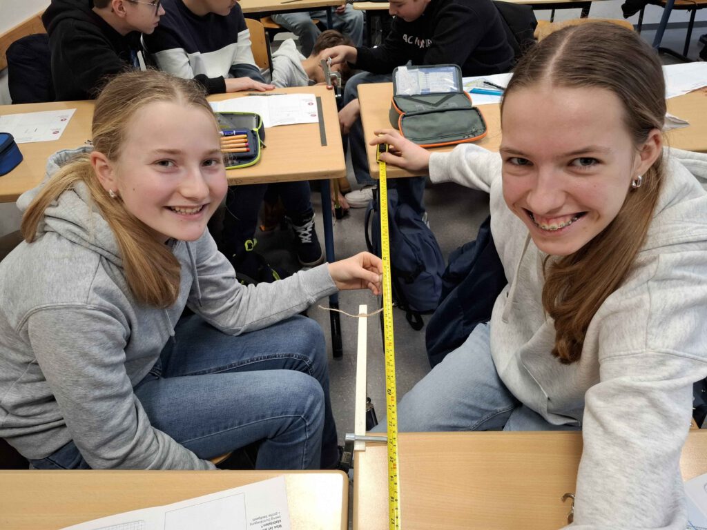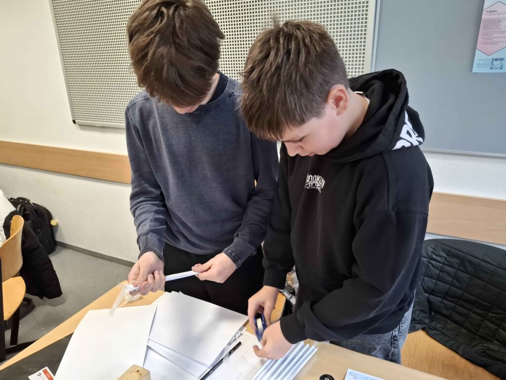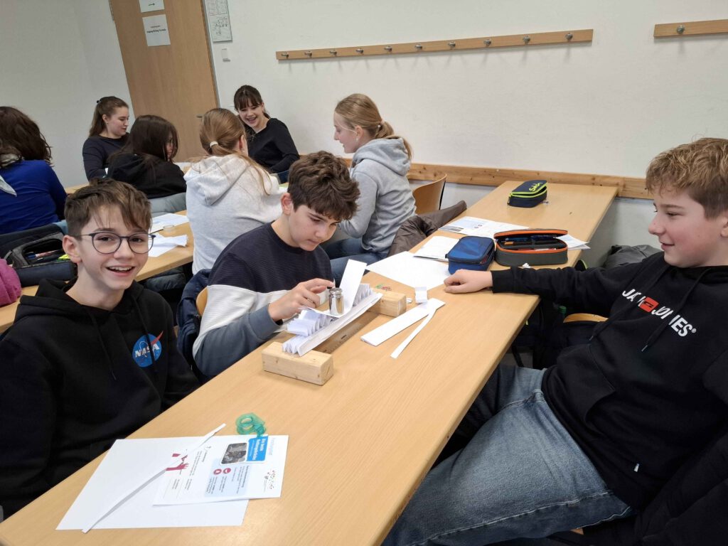 Bei der Klasse 8c drehte sich im Physik-Unterricht alles um das Thema „Leichtbau“. Alina Maar und Max Ohnemus, Studierende der THWS, waren zu Gast und hatten jede Menge Informationen und Experimentiermaterial im Gepäck. Als Leichtbau-Konstrukteurinnen und Konstrukteure mussten die Schülerinnen und Schüler der 8c das beste Material für den Bau einer Rettungsbrücke in Nepal durch Experimente finden.