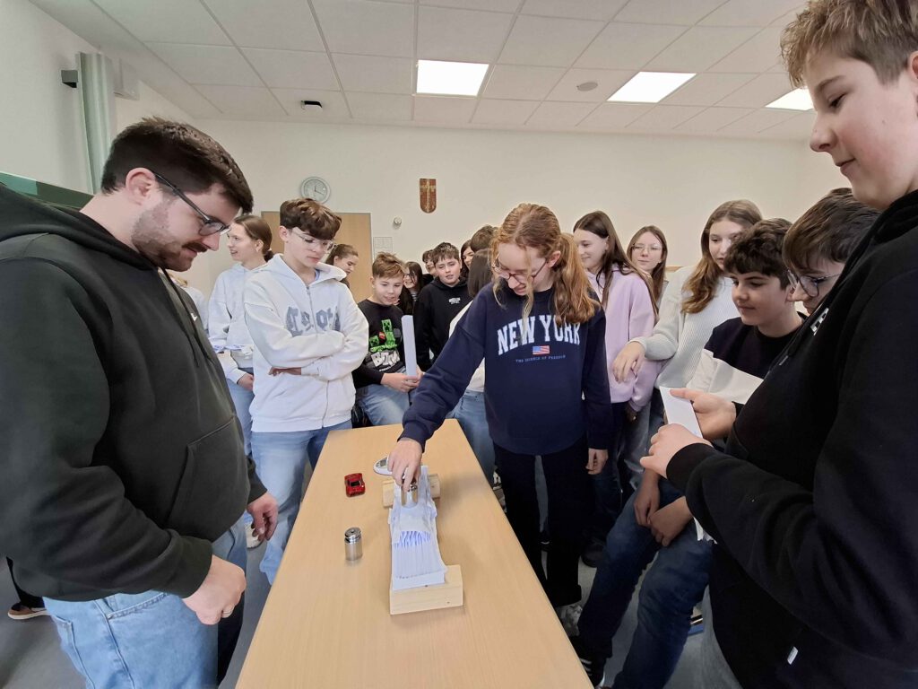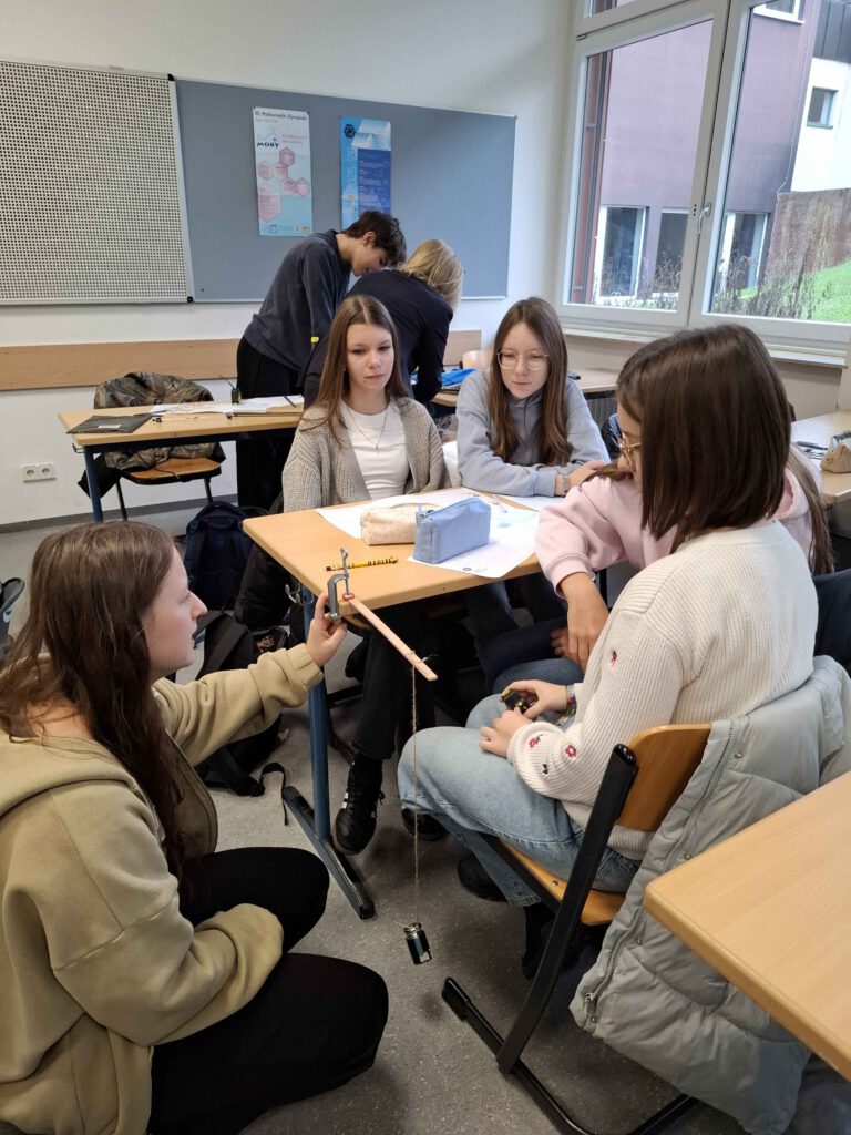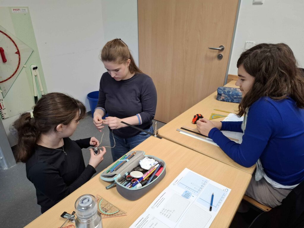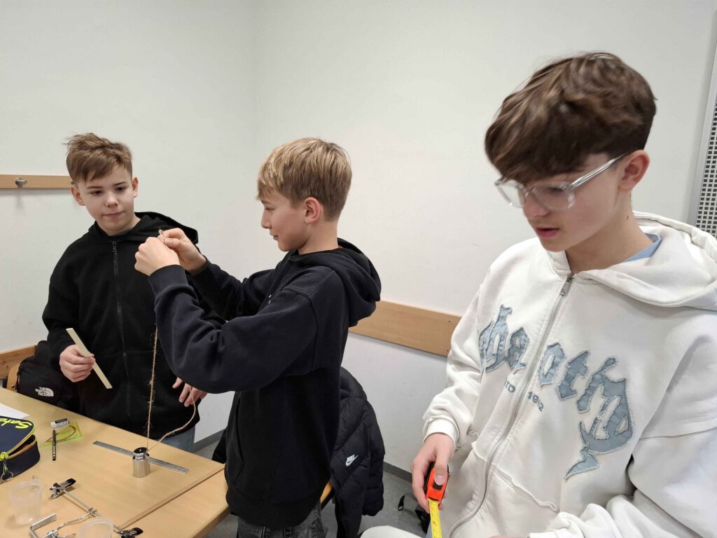 Bei der Klasse 8c drehte sich im Physik-Unterricht alles um das Thema „Leichtbau“. Alina Maar und Max Ohnemus, Studierende der THWS, waren zu Gast und hatten jede Menge Informationen und Experimentiermaterial im Gepäck. Als Leichtbau-Konstrukteurinnen und Konstrukteure mussten die Schülerinnen und Schüler der 8c das beste Material für den Bau einer Rettungsbrücke in Nepal durch Experimente finden.