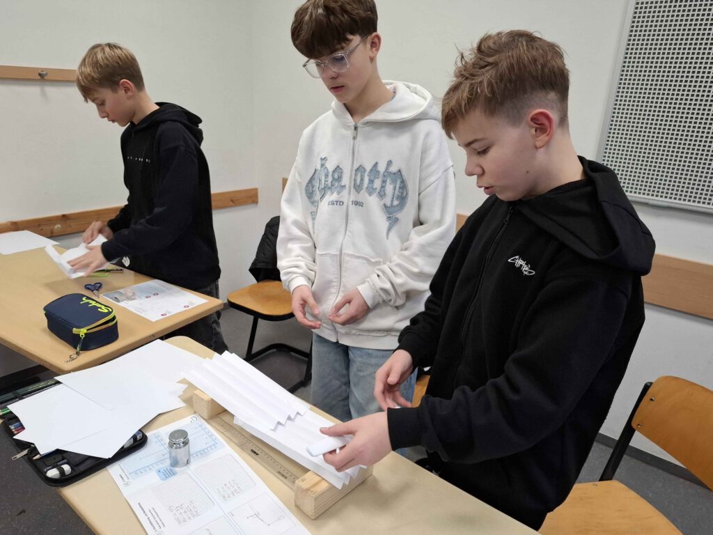 Die Ergebnisse wurden in einer Zwischenbesprechung ausgewertet, bevor es dann im zweiten Teil des Projekts darum ging, selbst mit einfachen und möglichst wenigen Materialien eine Brücke zu bauen, die gewissen Ansprüchen an Stabilität und Länge genügen musste. Hier war Kreativität gefragt und schnell entwickelte sich ein kleiner Wettstreit, welche Gruppe mit möglichst wenig Materialbedarf eine Brücke bauen konnte, die 30 cm überspannt und ein Massestück tragen kann, so dass es schließlich verschiedene Brückenkonstruktionen zu bewundern gab.