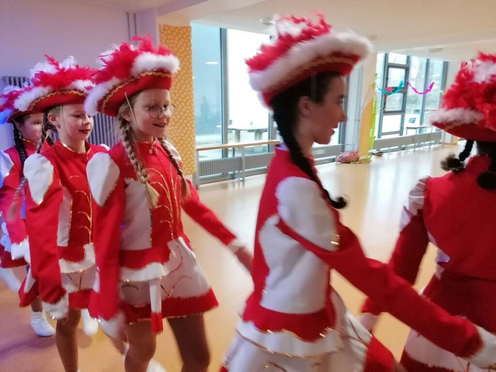 Bereits zu Beginn war die Vorfreude spürbar. Unter der Regie der engagierten Neuntklässler jagte ein Highlight das nächste. Bei Klassikern wie dem „Stopp-Tanz“ und der „Reise nach Jerusalem“ war volle Konzentration gefragt, während beim „Schokokussessen“ eher Geschicklichkeit und ein guter Appetit im Vordergrund standen. Die Stimmung erreichte bei den sportlichen Herausforderungen wie dem „Limbo-Wettbewerb“, dem rasanten „Luftballon-Lauf“ und dem koordinativ anspruchsvollen „Zeitungstanz“ ihren ersten Siedepunkt. Ein besonderer Moment für alle Beteiligten war auch die Kostümprämierung. Doch was wäre ein „Schmutziger Donnerstag“ ohne die Wahrung alter Bräuche? Unter lautem Jubel der Schülerschaft musste die Schulleitung symbolisch ihre Macht abtreten: In bester Faschingstradition wurden die Krawatten der Schulleitungsmitglieder fachgerecht gekürzt – ein Spaß, den Frau Lehrieder und Herr Bötsch mit Humor und im Geiste des närrischen Treibens über sich ergehen ließen. Den krönenden Abschluss bildete der fulminante Auftritt der Ochsenfurter Garde, die mit ihrer Choreografie und tänzerischen Präzision für staunende Gesichter und tosenden Applaus sorgte. „Die Stimmung war einfach fantastisch und es ist toll zu sehen, wie die Schulgemeinschaft zusammen feiert“, resümierte eine der organisierenden Tutorinnen sichtlich zufrieden.