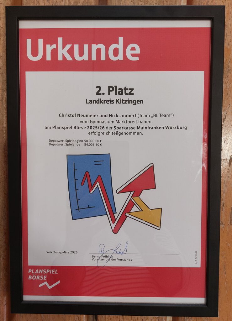 Bereits seit 1983, also seit mittlerweile 43 Jahren, veranstaltet der Sparkassen-Verband das bekannte Planspiel Börse, an dem sich unsere Schule regelmäßig beteiligt. Im Geschäftsbereich der Sparkasse Mainfranken, zu dem unsere Schule gehört, nahmen in diesem Jahr 553 Teams mit 1424 Schülerinnen und Schüler teil, europaweit waren es knapp 130.000 Jugendliche. Ziel des Planspiel ist es, in einer Spielzeit von knapp vier Monaten ein fiktives Startkapital von 50.000 € an der Börse zu maximieren.