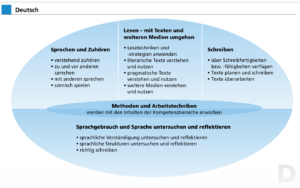 Der Deutschunterricht am Gymnasium ist auf langfristigen und nachhaltigen Wissens- und Kompetenzerwerbe angelegt. Er ist integrativ und verknüpft die im Lehrplan ausgewiesenen Kompetenzbereiche: „Sprechen und Zuhören“, „Lesen und mit Texten und weiteren Medien umgehen“, „Schreiben“ sowie „Sprache und Sprachgebrauch untersuchen und reflektieren“. Die genannten Kompetenzbereiche stehen nicht nebeneinander, sondern sind miteinander verknüpft. Der Kompetenzbereich „Sprache und Sprachgebrauch untersuchen und reflektieren“ verbindet die drei anderen, um zu veranschaulichen, dass die Sprachbetrachtung in funktionalen Zusammenhang mit Sprechen, Lesen und Schreiben steht.