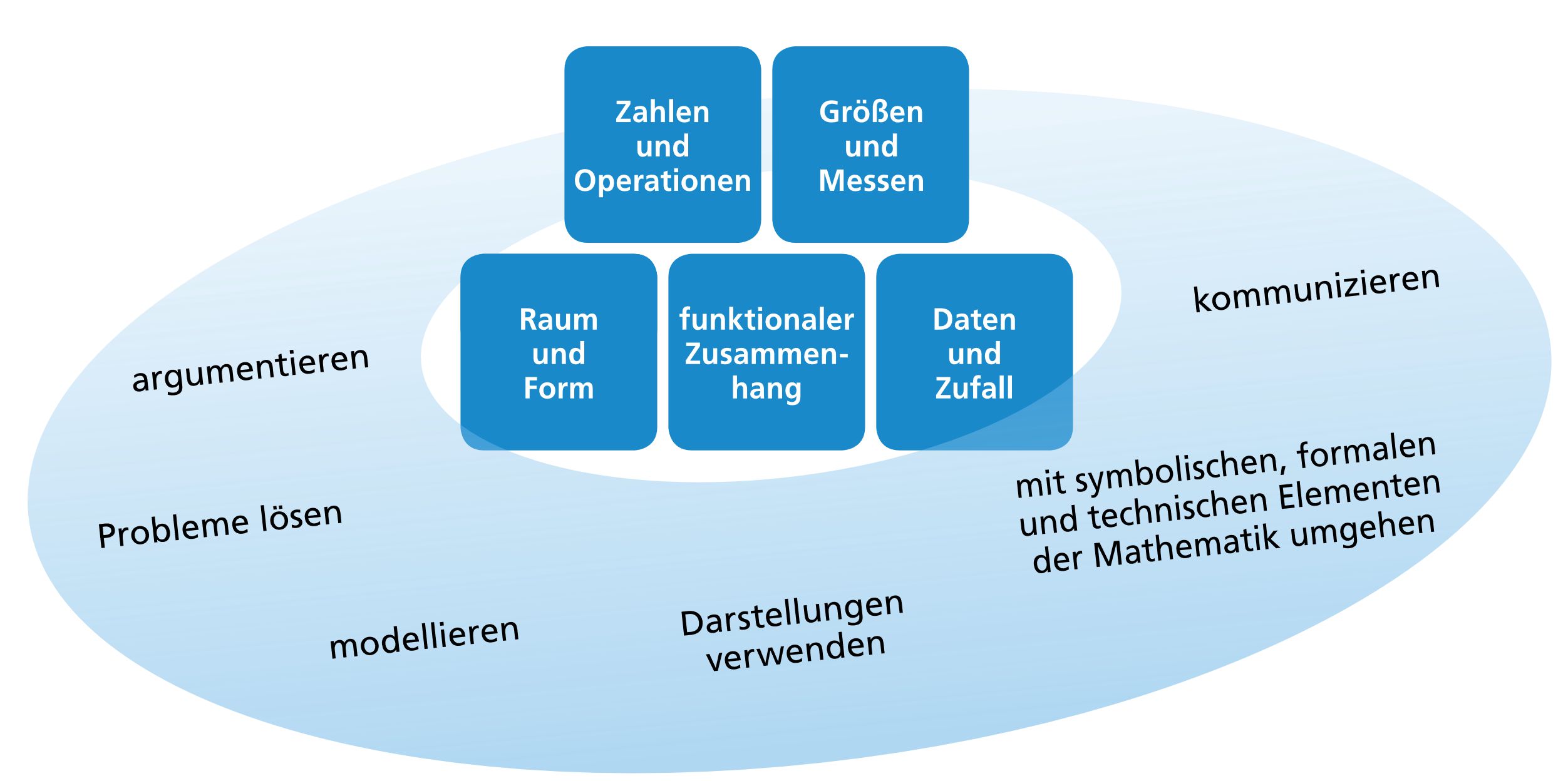 Die allgemeinen mathematischen Kompetenzen werden von den Schülerinnen und Schülern in aktiver Auseinandersetzung mit den mathematischen Inhalten – also nicht isoliert davon – erworben und angewandt. Entsprechend lassen sich die allgemeinen mathematischen Kompetenzen vielfältig inhaltsbezogen konkretisieren, wobei in der Regel an jedem Fachinhalt alle allgemeinen mathematischen Kompetenzen entwickelt werden können.